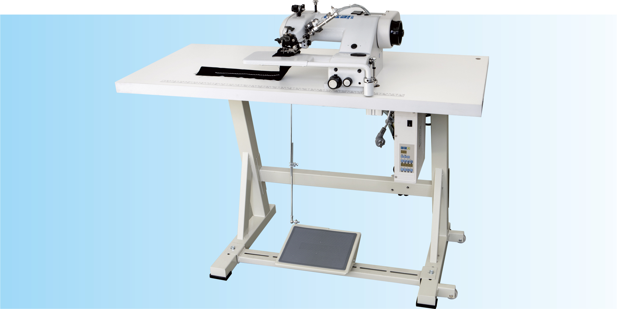 超大的缝臂空间即使缝制困难部位也觉得舒适 即使缝制具有高弹性或者超薄面料,机器的高预测性确保不会缝制超过限制 即使高速缝制也可保持完美的直线缝迹 缝制厚部跨缝时确认不会出现过底或印记