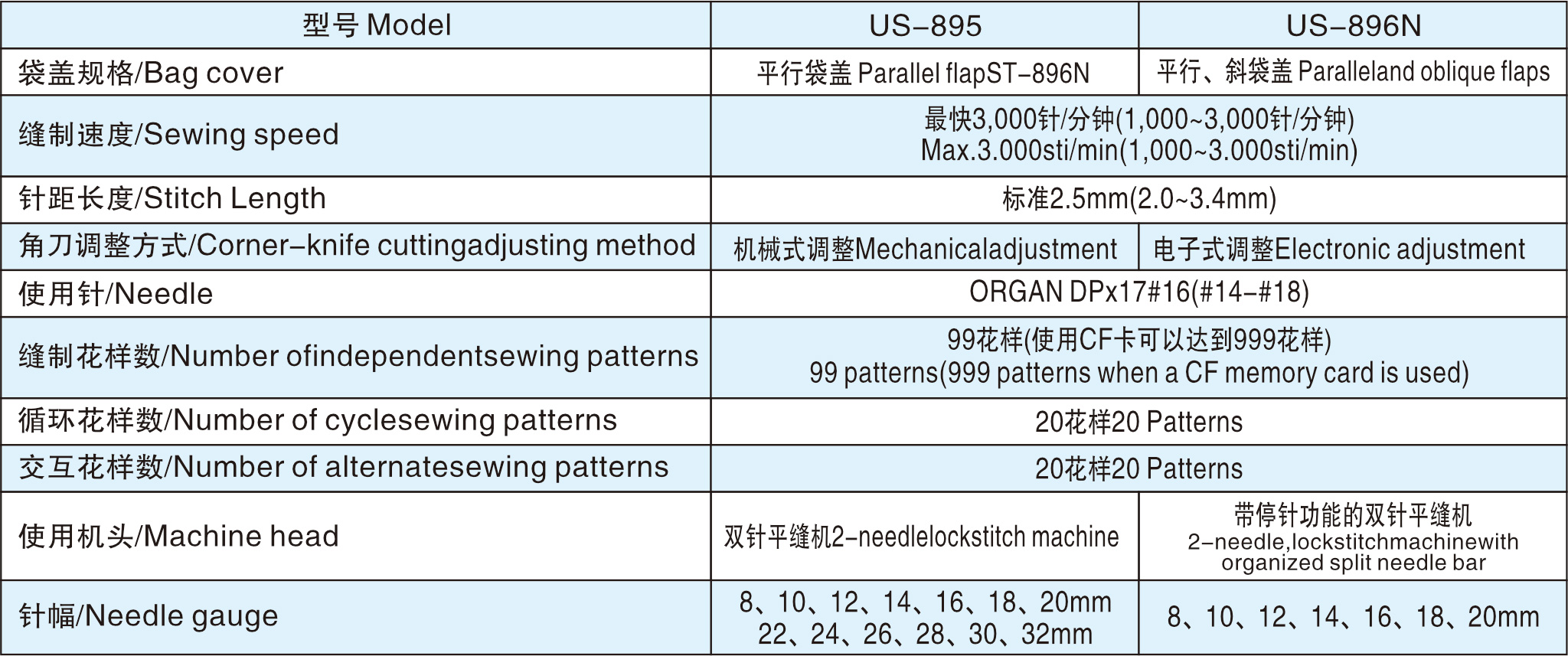 用于西裤、西装、休闲裤的平行袋(带袋盖)缝制。 双嵌条和单嵌条的切换可以通过操作板的按键一键完成。 扩大了缝制长度(最短18mm-最大220mm)