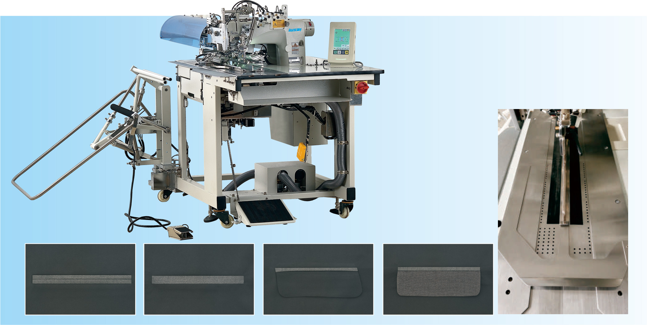 用于西裤、西装、休闲裤的平行袋(带袋盖)缝制。双嵌条和单嵌条的切换可以通过操作板的按键一键完成。扩大了缝制长度(最短18mm-最大220mm)